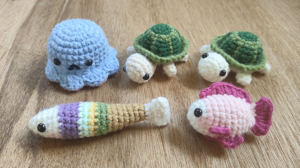 填充棉花。可钩织两个并在鱼嘴巴加入磁铁,做成情侣鱼。也可装入吱吱叫气囊,一捏发出响声,增加趣味性。
