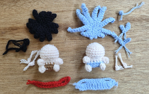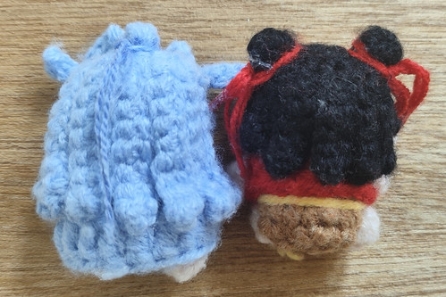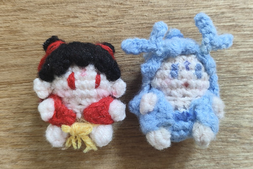 发包:环形钩4个未完成中长针(哪吒用黑色线钩2个,敖丙用蓝色线钩1个)
