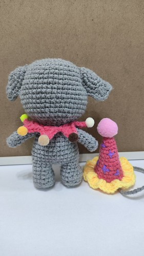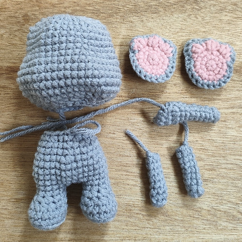 按照R1-R4用粉色毛线钩2个内耳,灰色毛线钩2个外耳,对叠用灰色毛线钩24X缝合