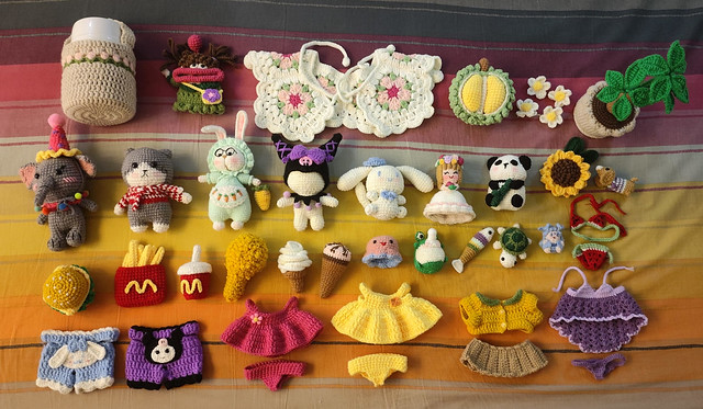 虽然购买这些材料总计花费不到150元,金额不算大,而且目前还剩下大部分材料未使用,但是钩织出一件作品,需要消耗很多的时间和精力。以前带娃逛商场外卖钩织物品的小摊位,感觉小小一件定价有些高。自己尝试后才发现,成品是不能用材料成本计算的。特别是新手阶段,经常钩错需要拆了重新再来,手速也慢,消耗的时间就更多了。虽然技术生疏,作品也不精致、不好看,但是自己一针一线钩织出来,每个作品都是有感情的。当然,也没办法用所消耗时间的时薪日薪月薪计算,那样定价就太过高昂,也很难售卖出去。看有些网络账号说在家钩织能够轻松养活自己甚至赚大钱,不知真假。以我目前的手速和技术,恐怕一个月加班加点,都很难赚到多少钱。