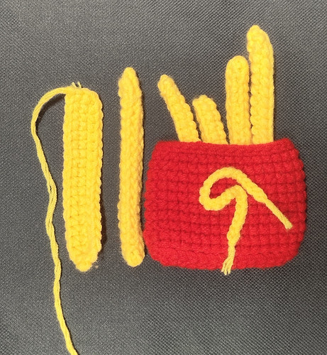 参照以上钩法,钩17CH,15CH……长短不同的薯条,每条钩织完成后将织片对折,缝合两个内半针