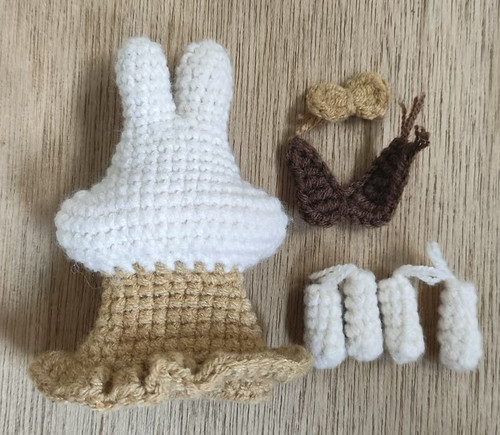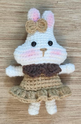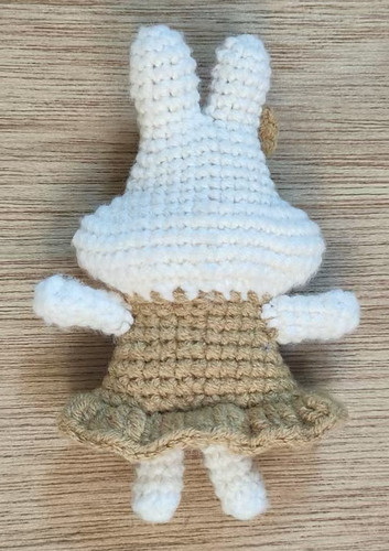 备注:主体塞棉后,用浅棕色毛线缝合裙尾,并将两条腿一起缝合进去。最后缝合两条胳膊、粘贴眼睛和蝴蝶结。用浅棕色毛线缝上鼻子,耳朵和脸刷腮红。