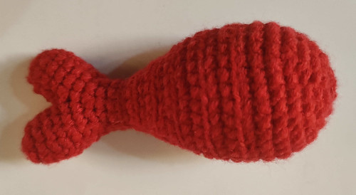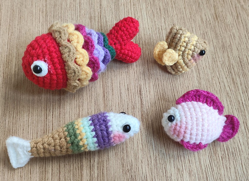 后记:没有钩织鱼鳞的锦鲤形状很像鸡腿,等钩织完成后,hillway评价为“转基因的中毒的变异鱼”。另外两种小鱼款式参见《两种小鱼钩织法(1)》。