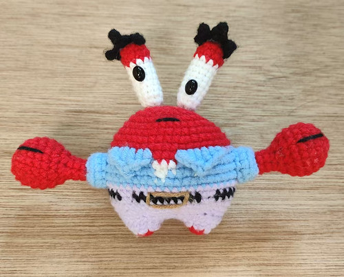 备注:用蓝色毛线将胳膊缝合在身体两侧,白色毛线缝合眼睛在头顶位置。粘贴眼睫毛和眼珠。用黑色毛线缝嘴巴和蟹钳分叉,用棕色毛线缝腰部长方形装饰。两个衣领总是翘起来,用蓝色毛线缝在衣服上固定。